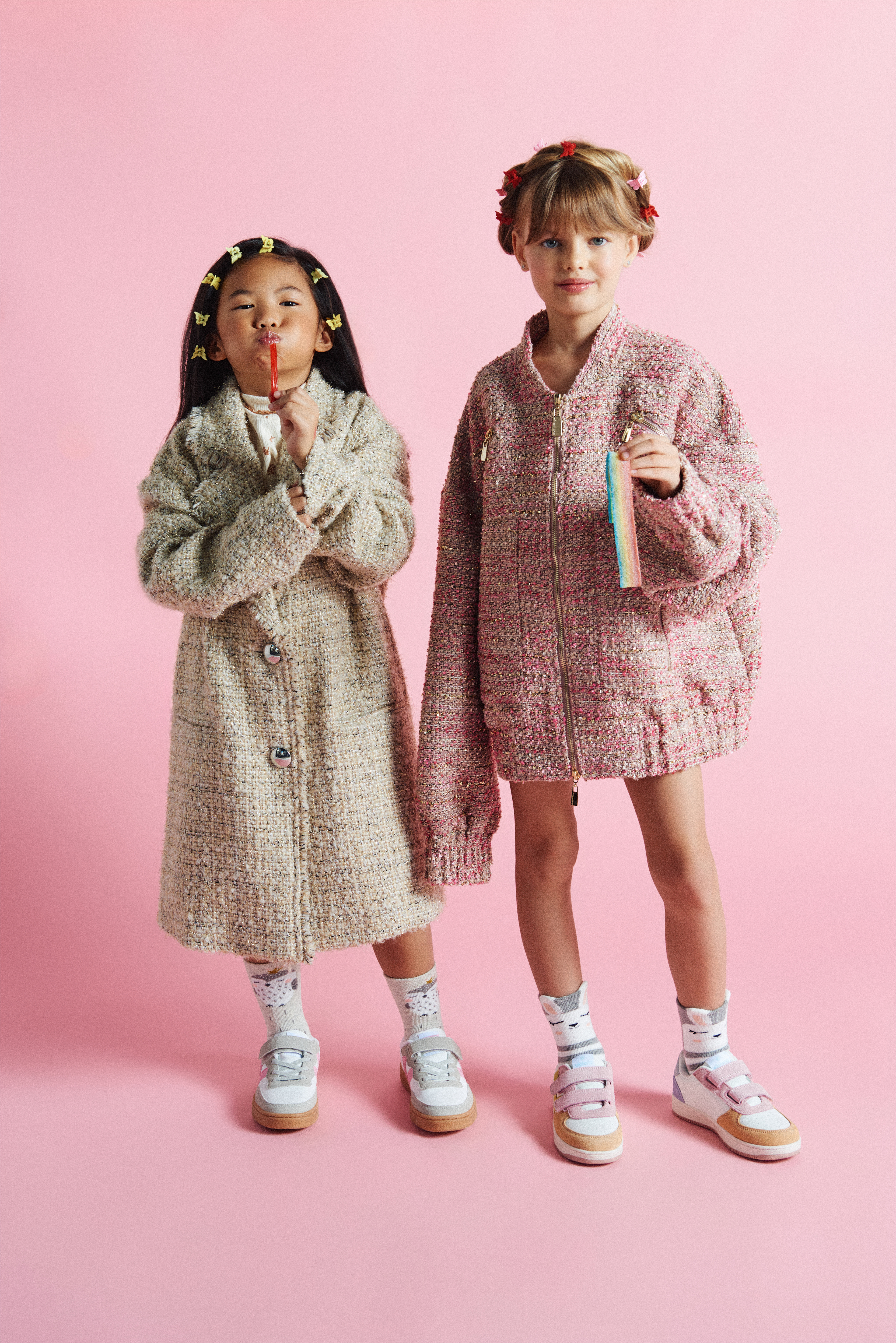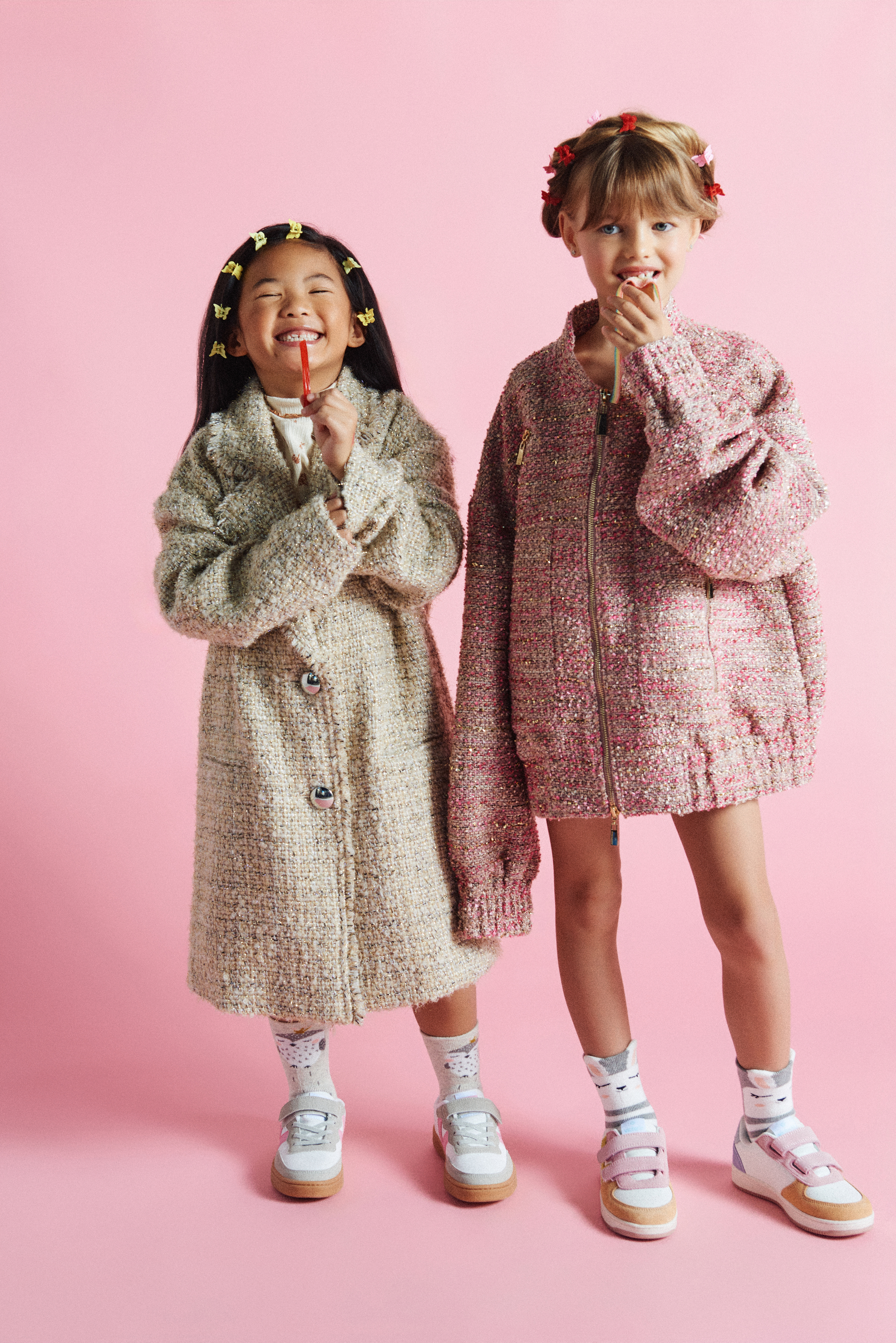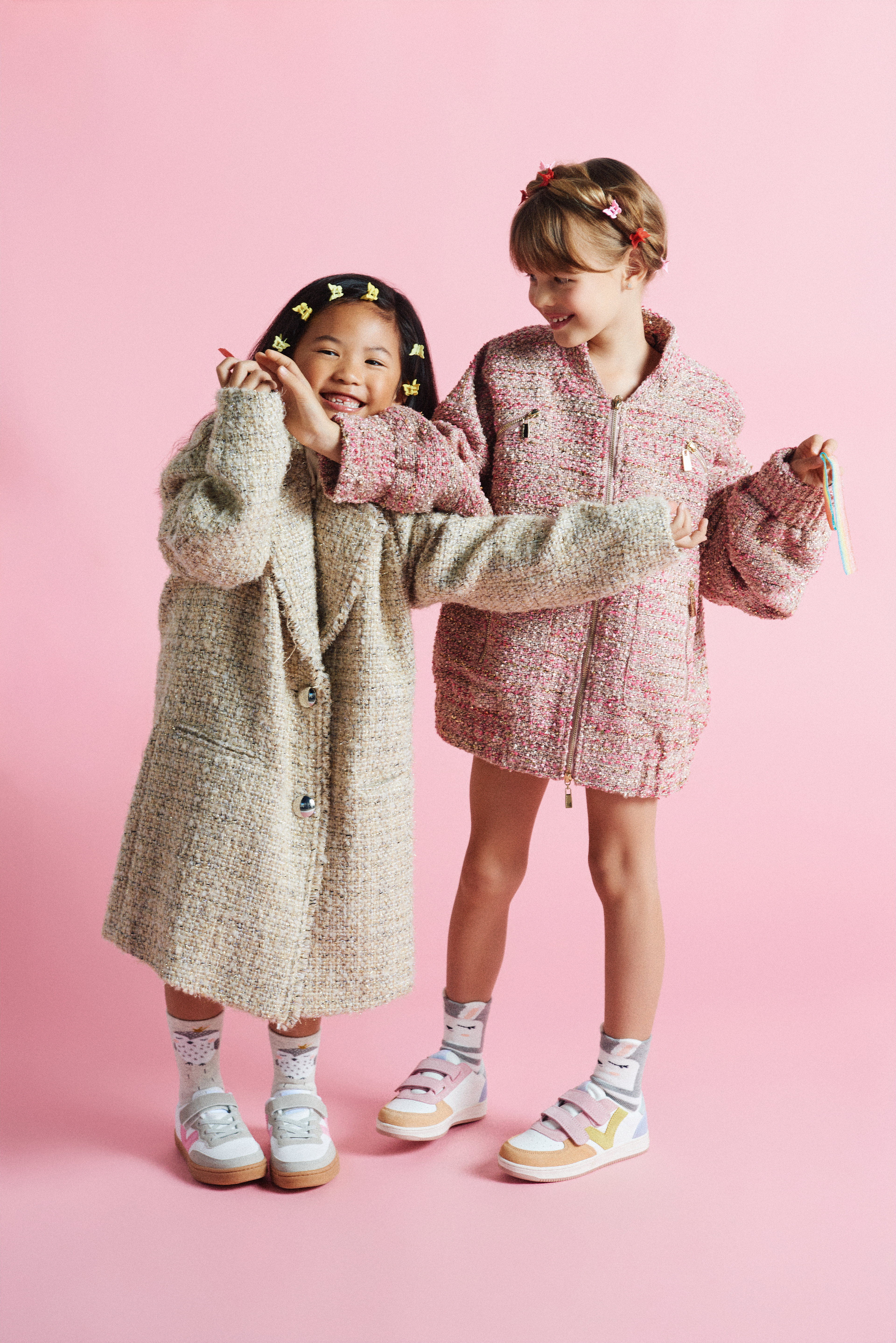 Noelia con chaqueta tweed dorada de Twinset Actitude @actitude_twinset x Finally Press @finallypress y jersey de cuello vuelto de Gingersnaps @gingersnapsph x Kidscom Agency @kidscomagency ; Arya con bomber tweed rosa de Lola Casademunt @lolacasademunt x XXL Comunicacion @xxlcomunicacion y ambas llevan zapatillas Victoria @zapatillas_victoria_ x Finally Press @finallypress .