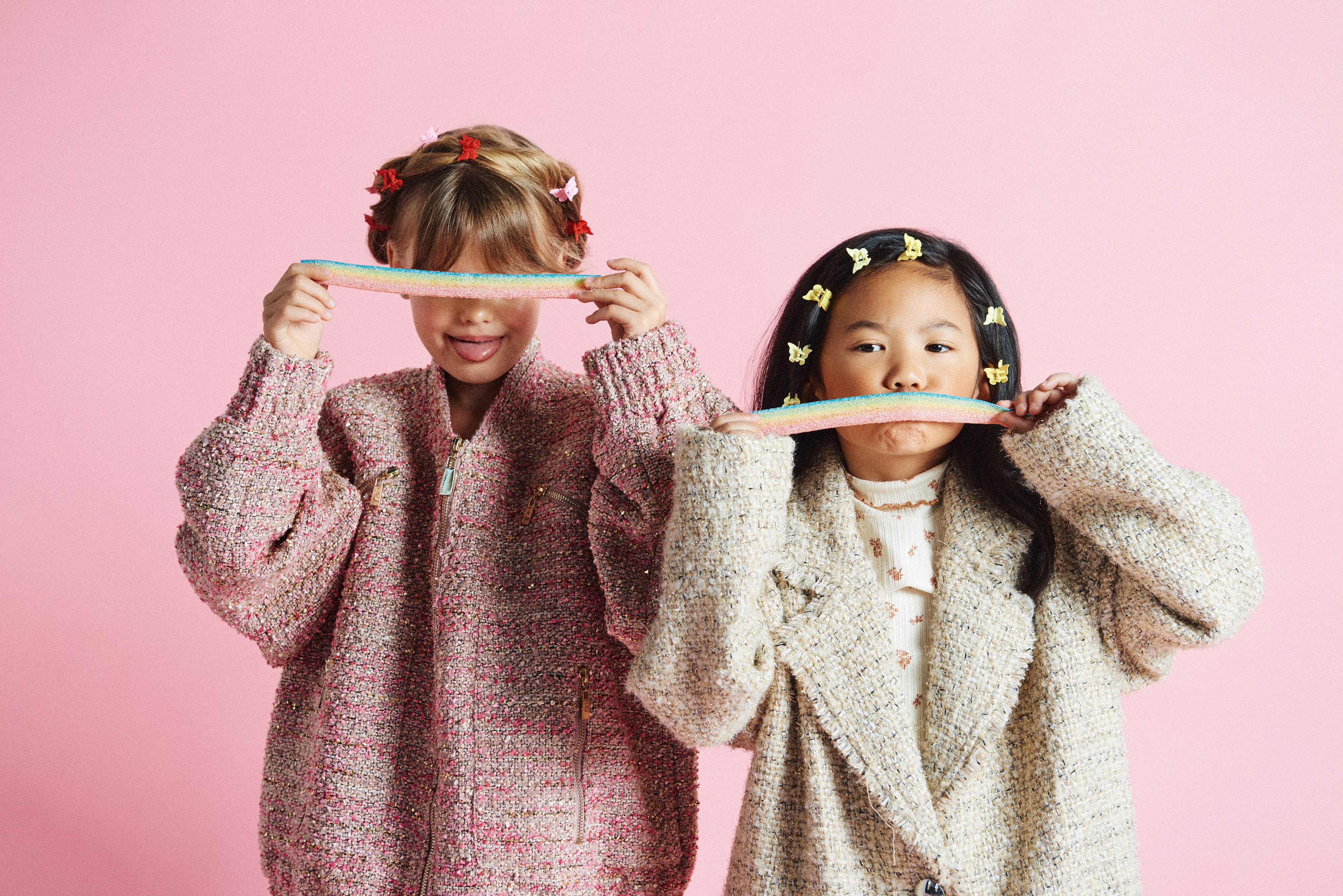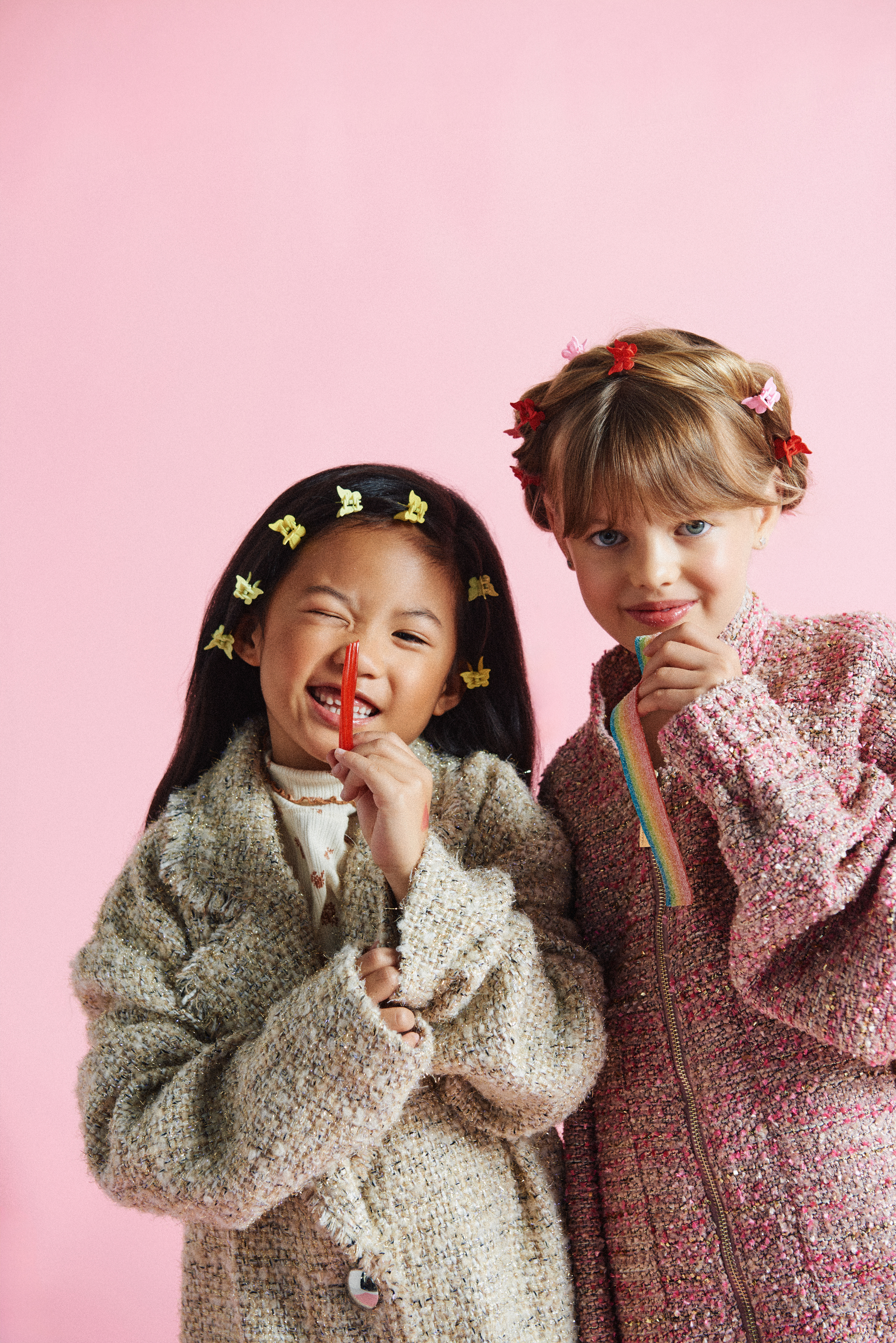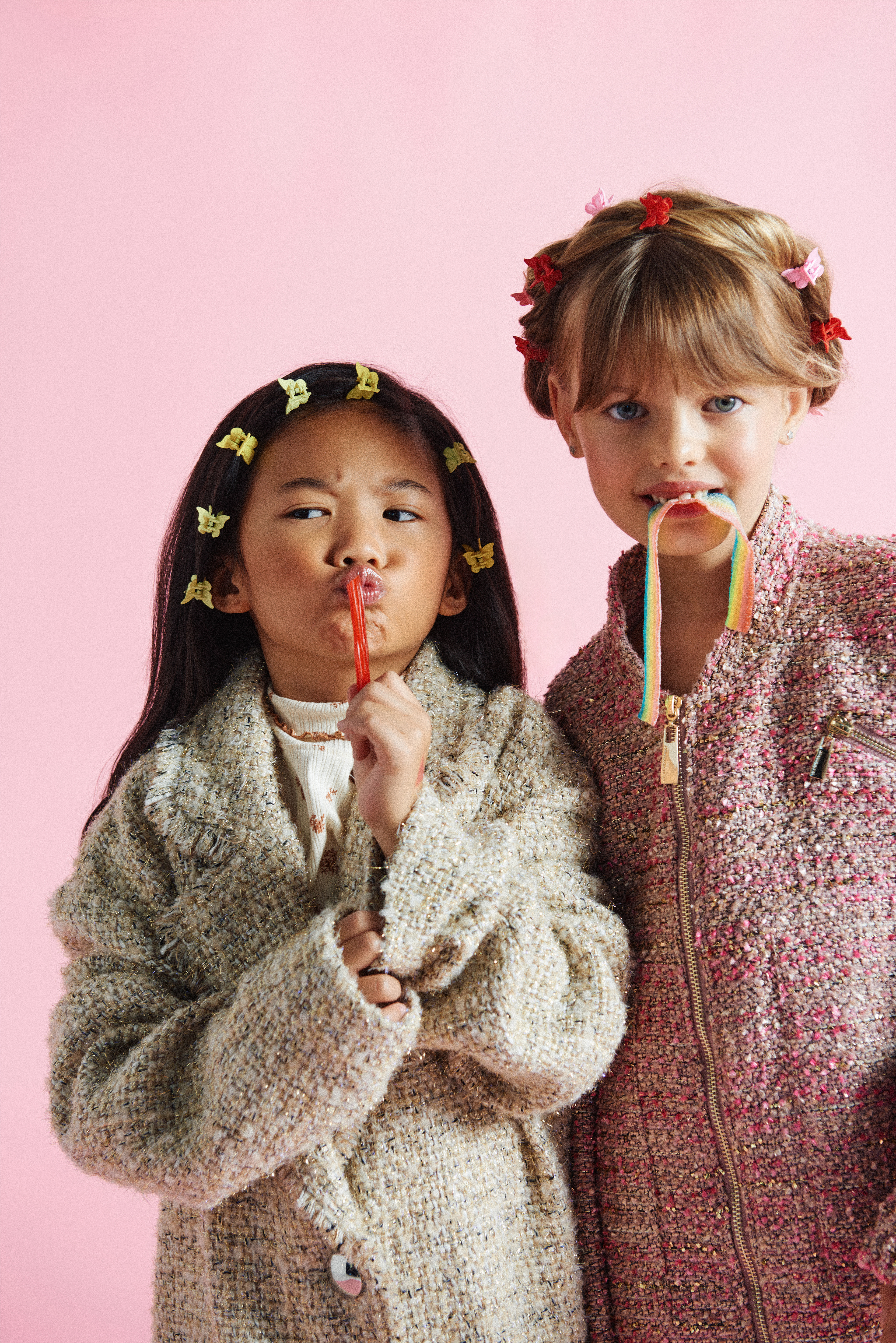 Noelia con chaqueta tweed dorada de Twinset Actitude @actitude_twinset x Finally Press @finallypress y jersey de cuello vuelto de Gingersnaps @gingersnapsph x Kidscom Agency @kidscomagency ; Arya con bomber tweed rosa de Lola Casademunt @lolacasademunt x XXL Comunicacion @xxlcomunicacion y ambas llevan zapatillas Victoria @zapatillas_victoria_ x Finally Press @finallypress .