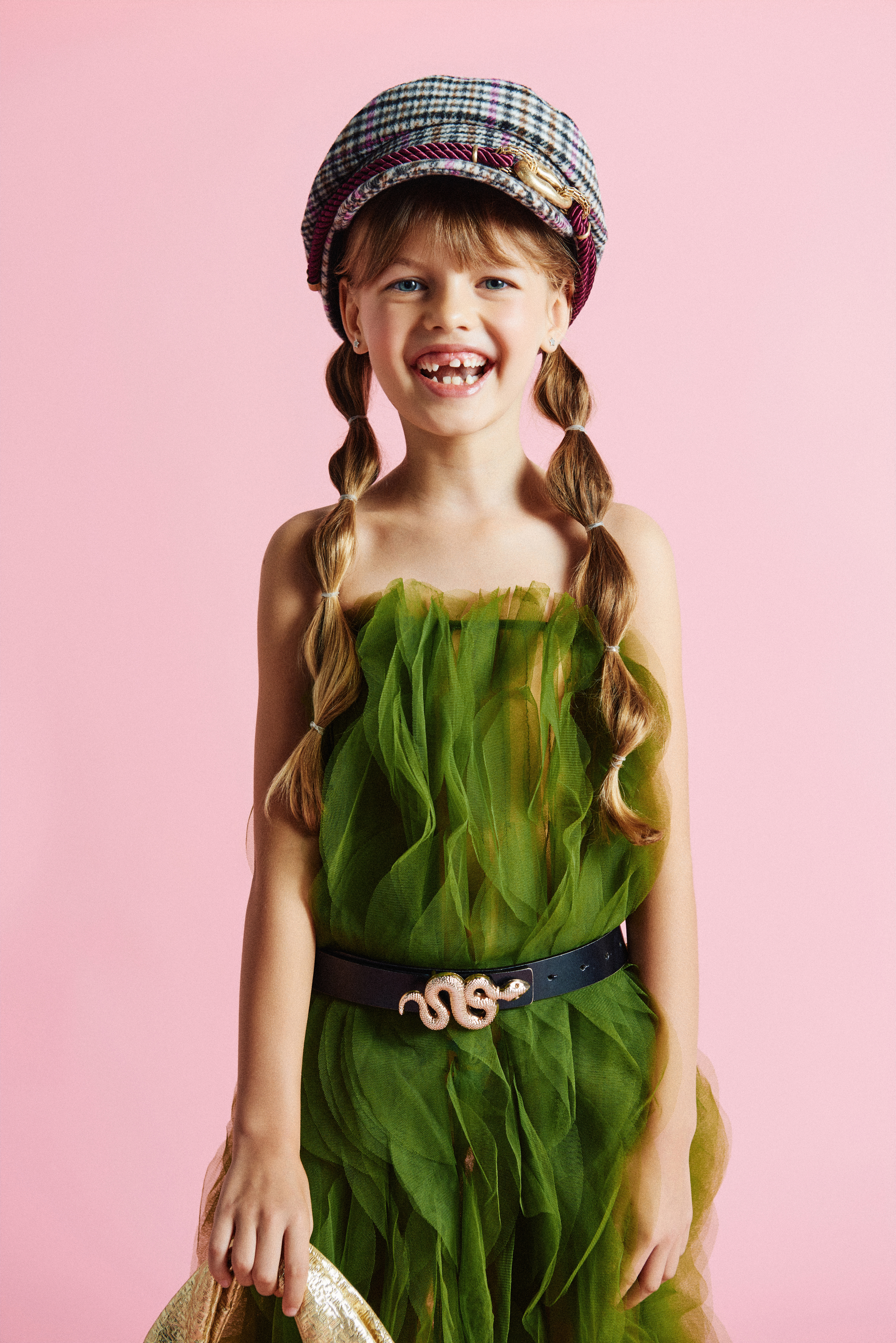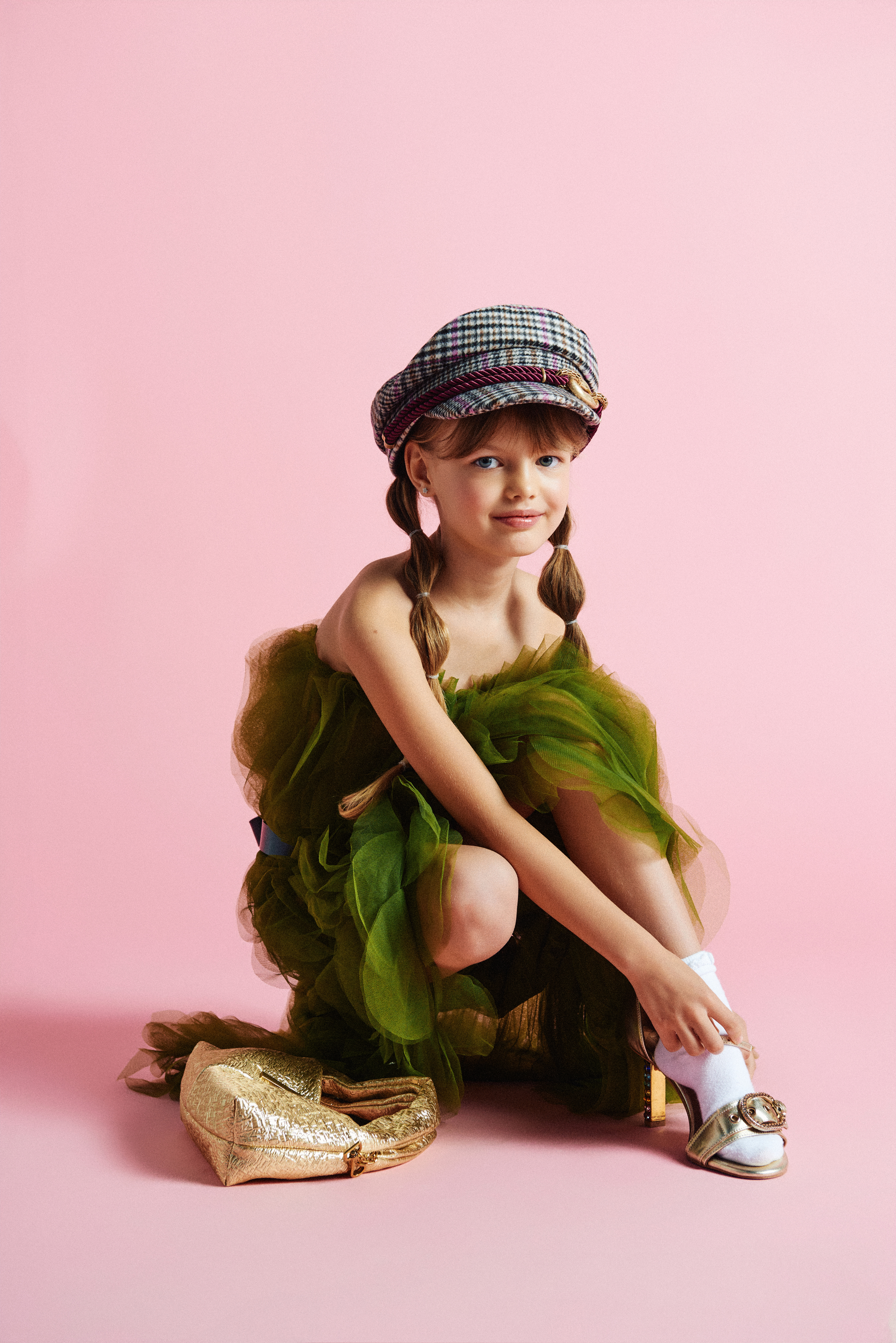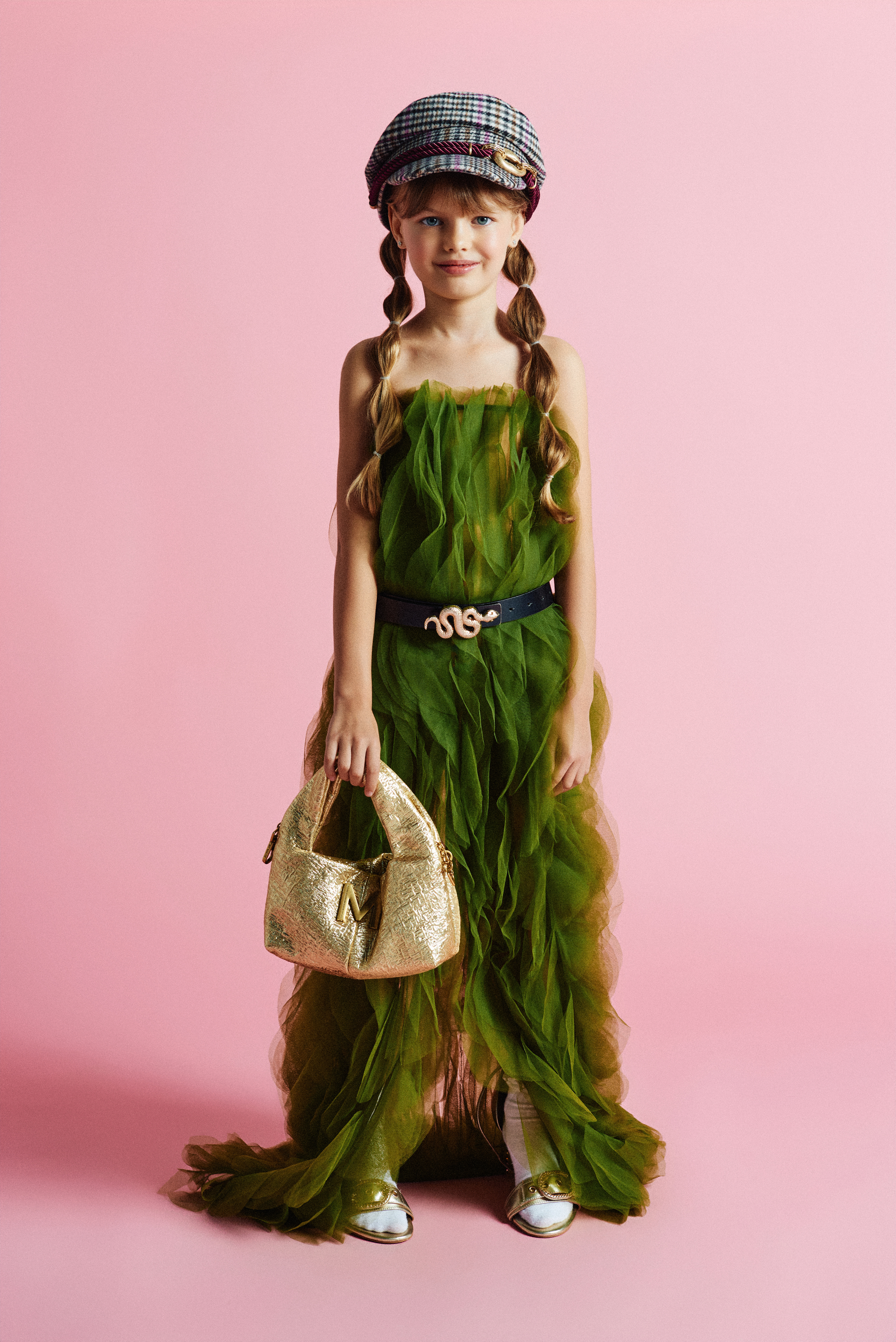 Arya luce falda verde de tul; bolso de mano dorado y boina de cuadros de Lola Casademunt @lolacasademunt x XXL Comunicación @xxlcomunicacion y sandalias de tacón doradas con pedrería de Kurt Geiger @kurtgeiger x Vía Comunicación @viacomunicacion .