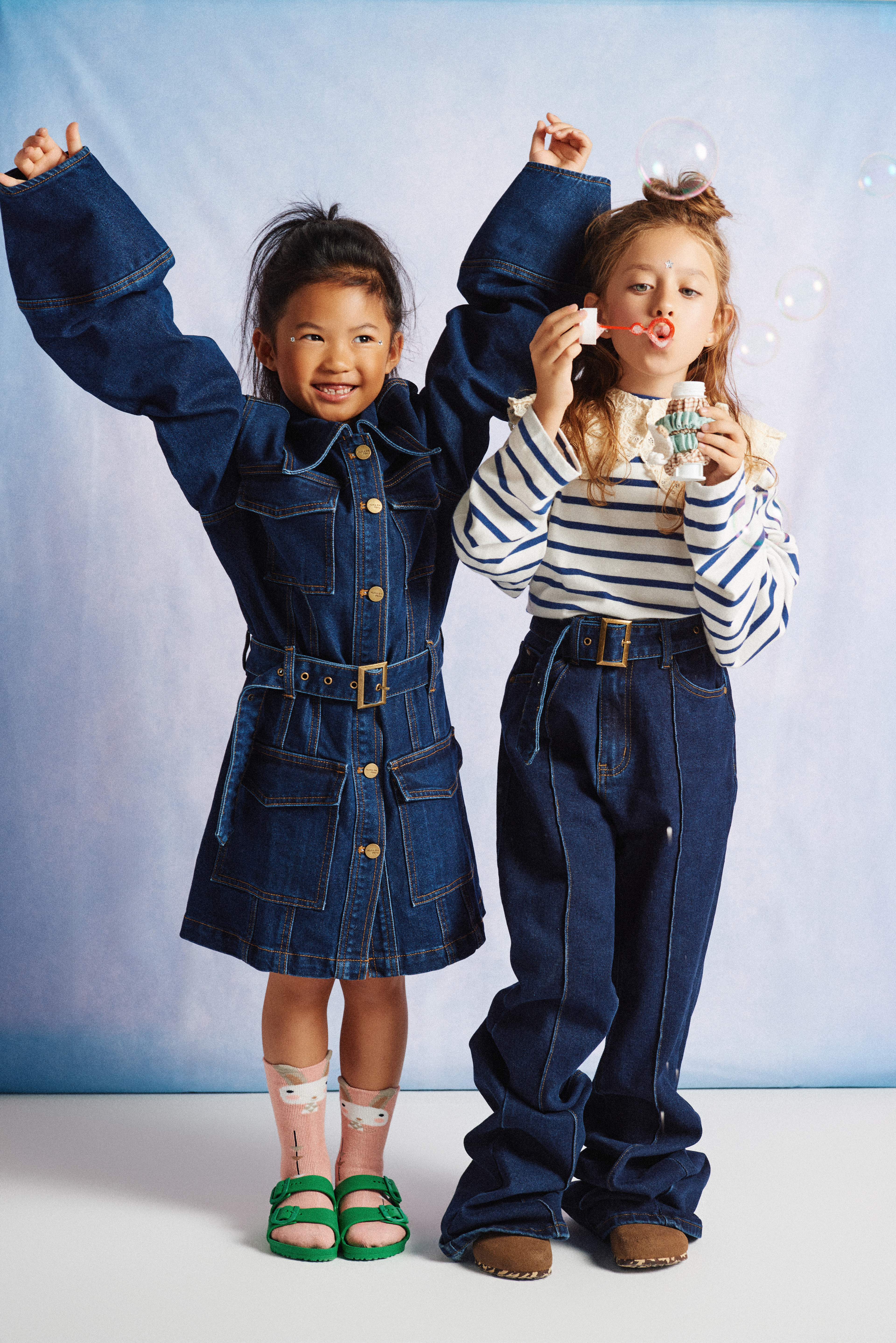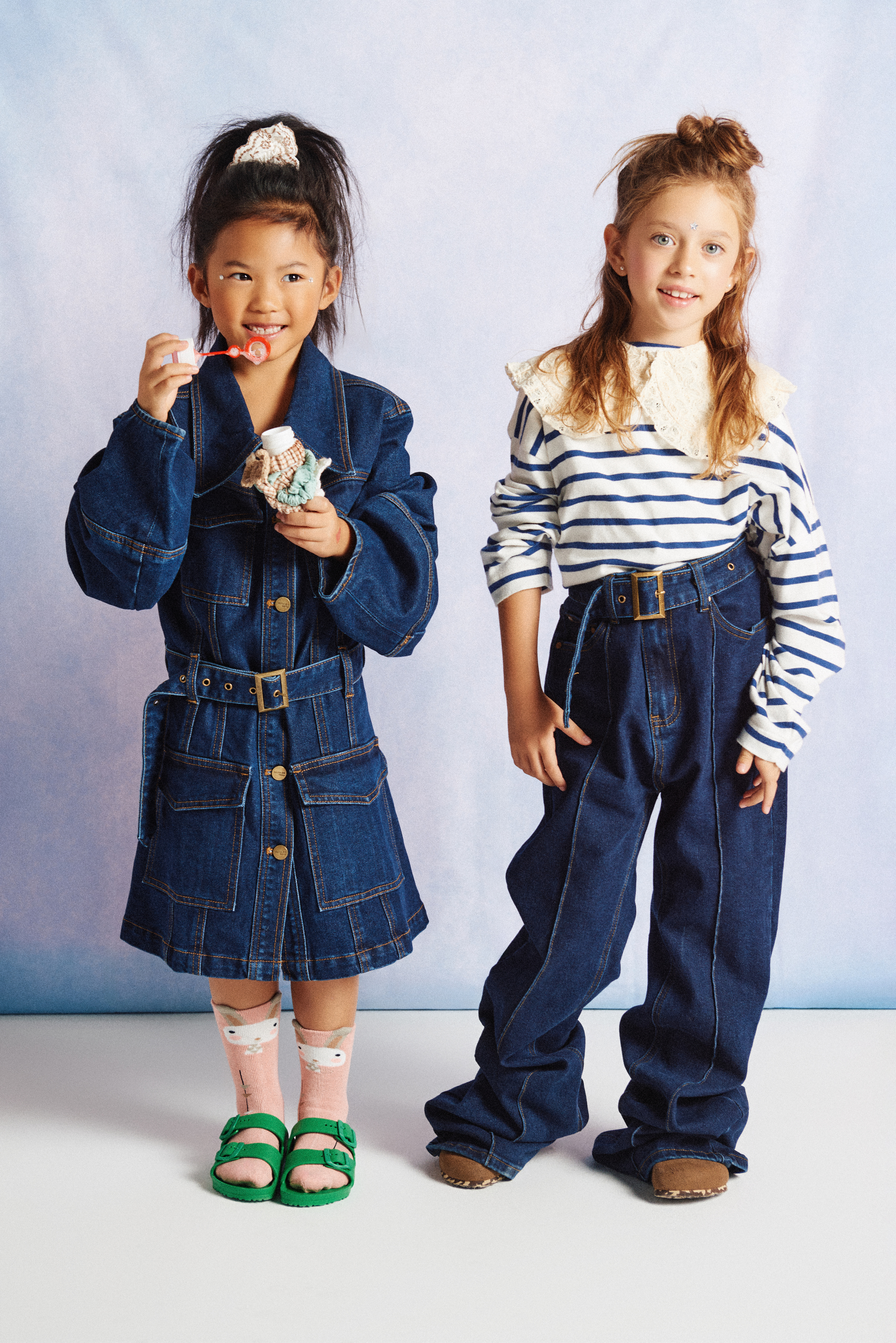 Noelia y Maryam comparten total look denim de Alma en Pena @almaenpenashoes x Vía Comunicación @viacomunicacion ; Maryam lleva camiseta de rayas oversize de Bellerose @belleroseofficial x Kidscom Agency @kidscomagency y cuello de crochet nude de Gingersnaps @gingersnapsph x Kidscom Agency @kidscomagency ; Sandalias y zuecos Birkenstock @birkenstock x Finally Press @finallypress .