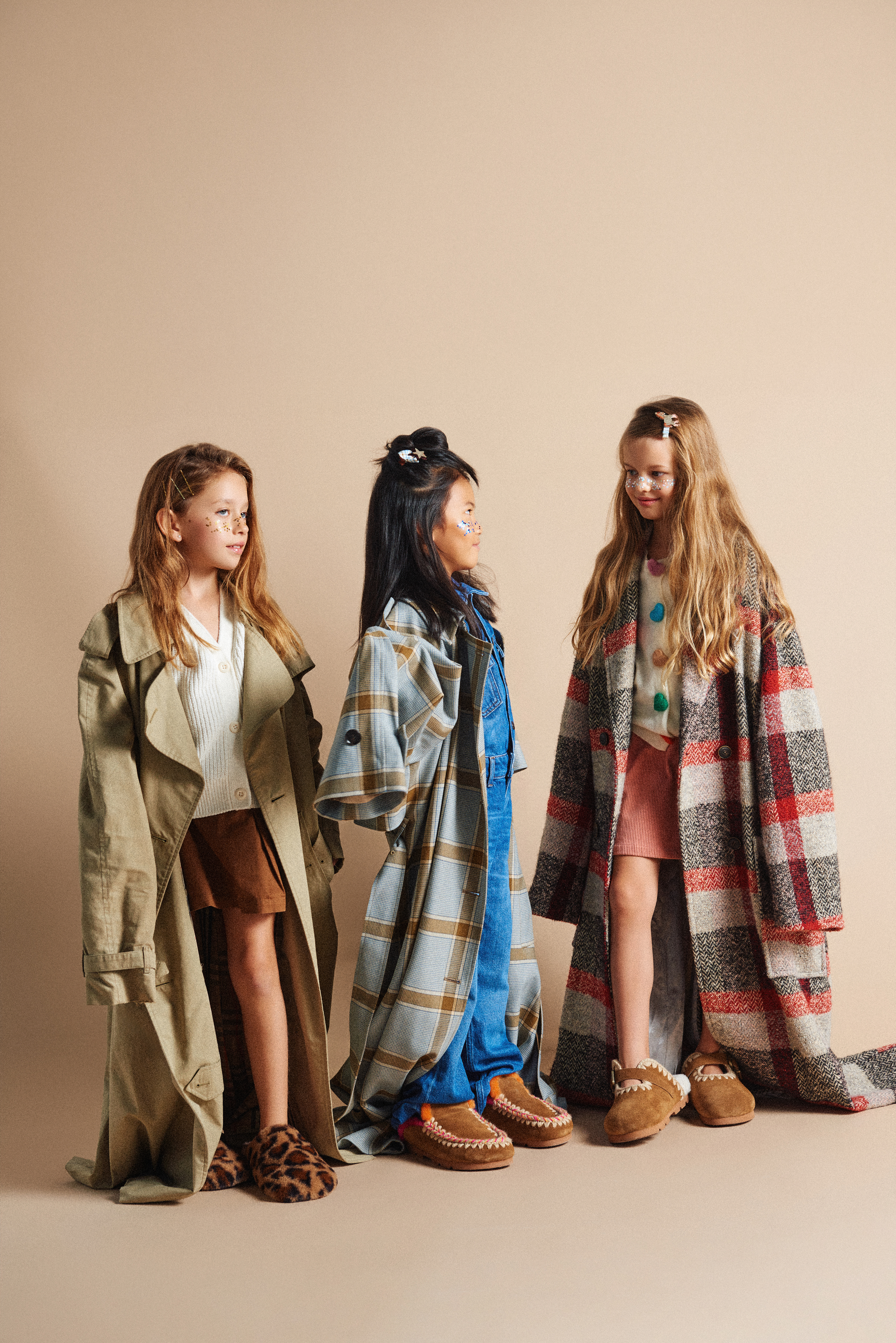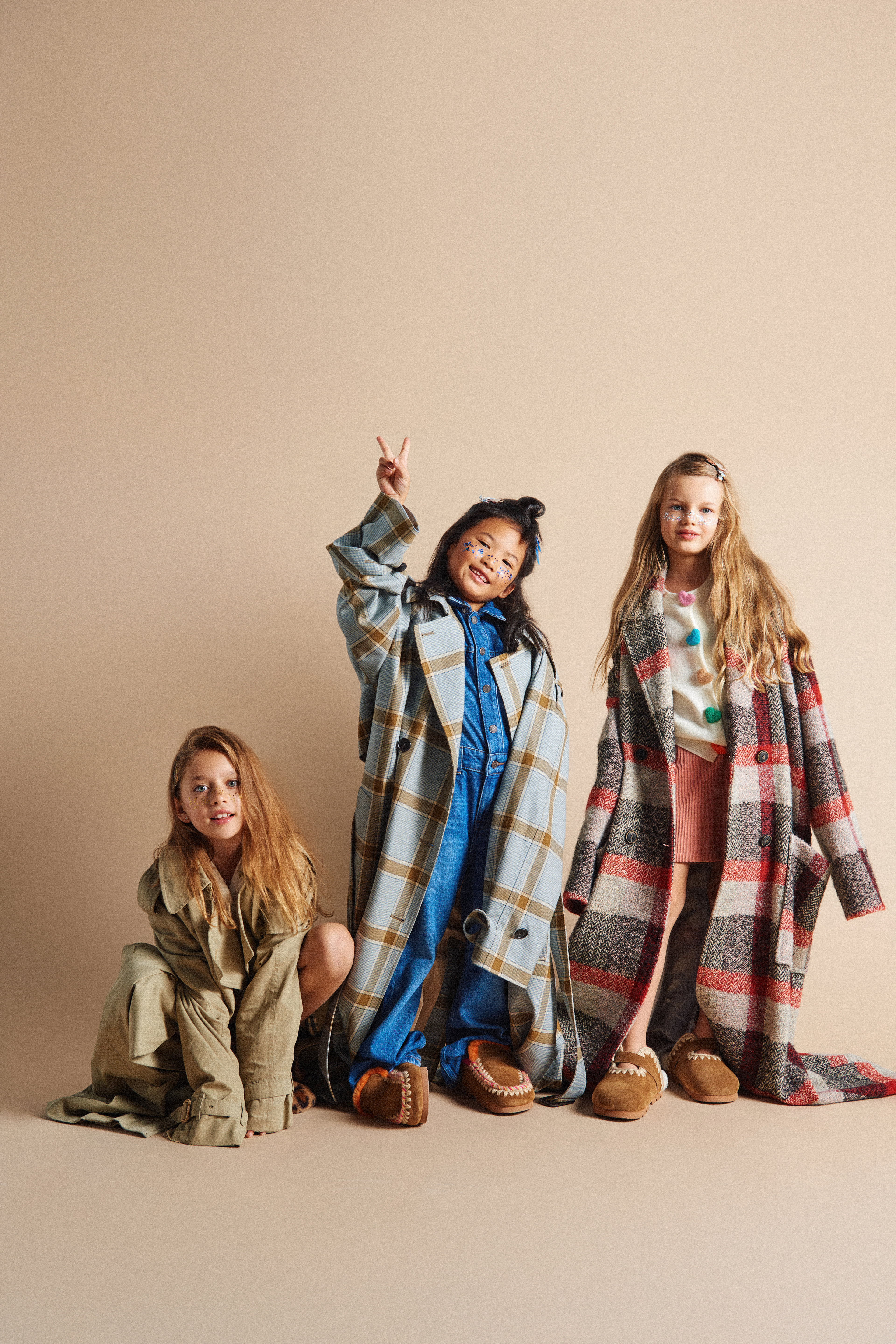 Por último Arya con gabardina de cuadros negros y rojos de Momoni @momoni_official x Vía Comunicación ; chaqueta de lana blanca y mini falda de pana rosa de Compañía Fantástica Mini @companiafantasticamini x Kidscom Agency @kidscomagency y zapatillas marrones de ante de MOU @moufootwear x Finally Press @finallypress .